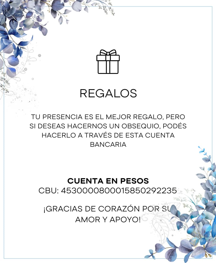LO MÁS IMPORTANTE ES QUE NOS ACOMPAÑES EN ESTE DÍA TAN ESPECIAL, PERO SI QUERÉS HACERNOS UN REGALO, PODÉS HACERLO A TRAVÉS DE ESTA CUENTA