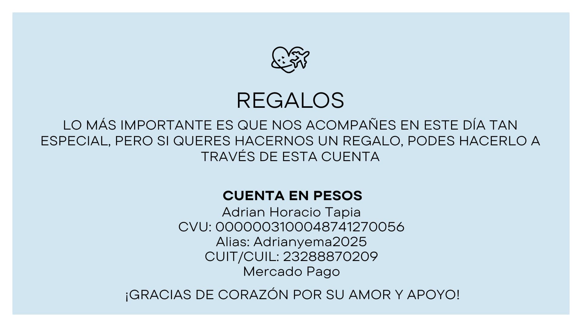 LO MÁS IMPORTANTE ES QUE NOS ACOMPAÑES EN ESTE DÍA TAN ESPECIAL, PERO SI QUERÉS HACERNOS UN REGALO, PODÉS HACERLO A TRAVÉS DE ESTA CUENTA